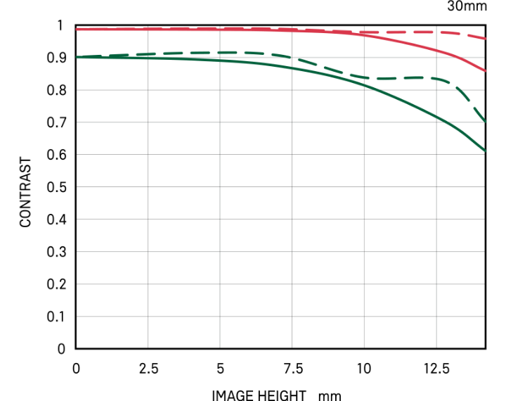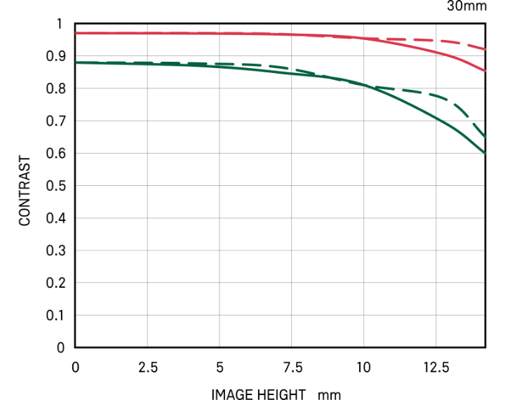 MTF (Modulation Transfer Function – Hàm Truyền Tải Điều Biến) là một trong những phép đo để đánh giá hiệu suất của ống kính, và nó cho thấy độ trung thực mà độ tương phản của chủ thể có thể được tái tạo trên mặt phẳng ảnh. Trục ngang thể hiện chiều cao ảnh (khoảng cách từ tâm ảnh tính bằng mm) và trục dọc thể hiện giá trị tương phản (giá trị tối đa là 1).