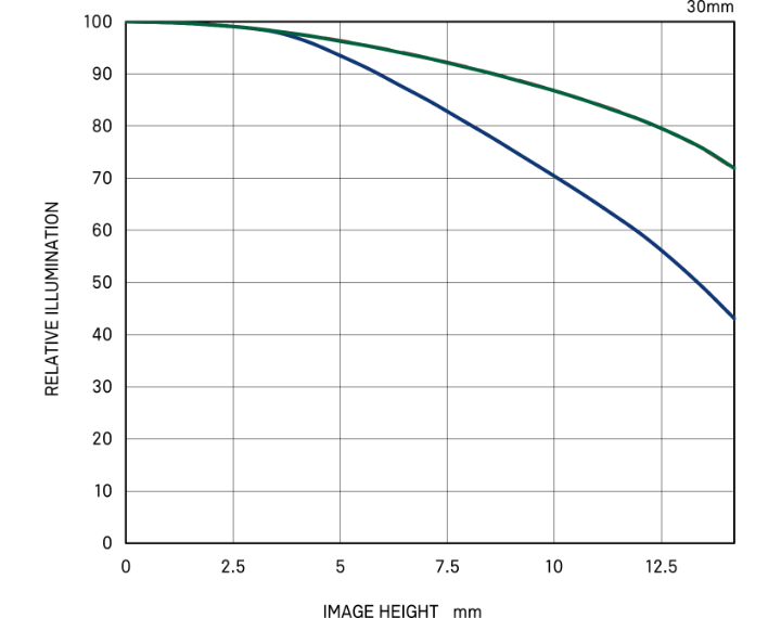 Trục ngang thể hiện chiều cao ảnh (khoảng cách từ tâm đến cạnh ảnh [mm]). Trục dọc thể hiện lượng ánh sáng trong ảnh (dựa trên lượng ánh sáng ở tâm ảnh là 100%). Nếu lượng ánh sáng ngoại vi thấp hơn tâm, bốn góc của ảnh sẽ tối hơn (hiện tượng tối góc).