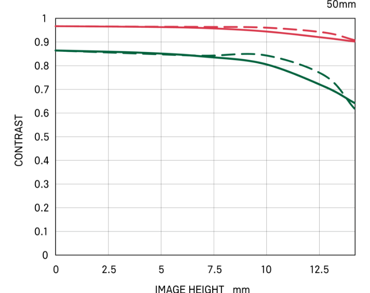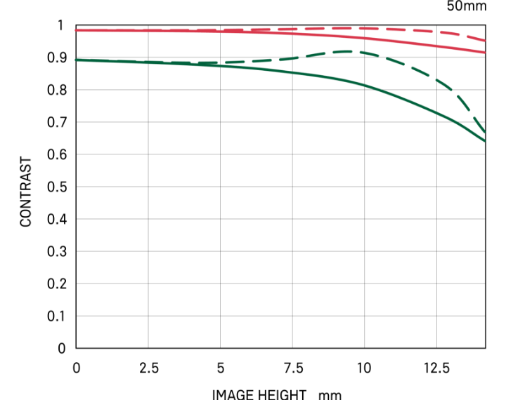 MTF (Hàm truyền dẫn điều biến) là một trong những chỉ số để đánh giá hiệu suất của ống kính, nó cho thấy mức độ trung thực trong việc tái tạo độ tương phản của chủ thể trên mặt phẳng ảnh. Trục ngang biểu thị chiều cao ảnh (khoảng cách từ tâm ảnh tính bằng mm) và trục dọc biểu thị giá trị tương phản (giá trị tối đa là 1).