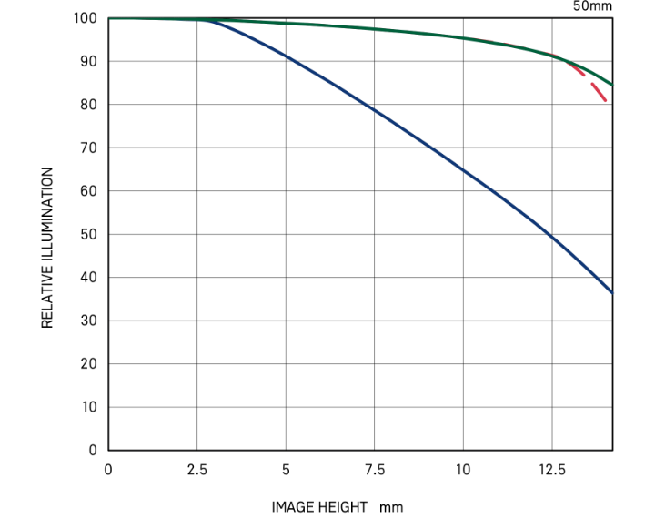 Trục ngang hiển thị chiều cao ảnh (khoảng cách từ tâm đến cạnh của hình ảnh [mm]). Trục dọc hiển thị lượng ánh sáng trong hình ảnh (dựa trên lượng ánh sáng ở trung tâm hình ảnh là 100%). Nếu lượng ánh sáng ở vùng biên thấp hơn ở trung tâm, bốn góc của hình ảnh sẽ tối hơn (hiện tượng tối góc/vignetting).
