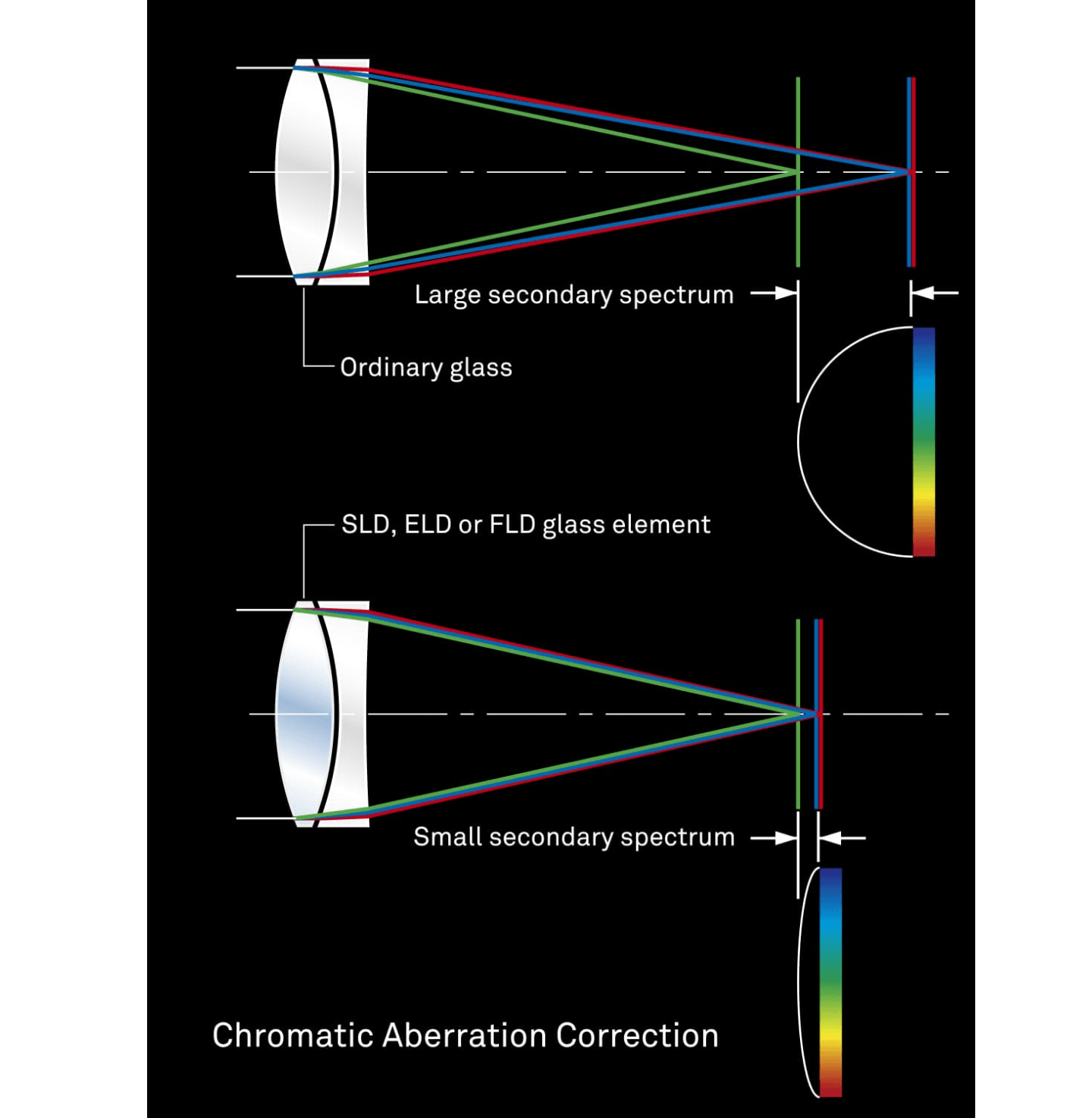 Mức độ ánh sáng bị khúc xạ bởi thủy tinh phụ thuộc vào bước sóng của ánh sáng. Thực tế này làm cho các màu sắc ánh sáng khác nhau hội tụ tại các điểm hơi khác nhau. Kết quả là quang sai màu (chromatic aberration), hiện tượng viền màu đặc biệt dễ nhận thấy ở các ống kính tele. Hầu hết quang sai màu có thể được loại bỏ bằng cách kết hợp một thấu kính lồi có độ khúc xạ cao với một thấu kính lõm có độ khúc xạ thấp. Tuy nhiên, quang sai màu còn sót lại, được gọi là “phổ thứ cấp” (secondary spectrum), vẫn có thể tồn tại. Để giảm thiểu phổ thứ cấp này, vốn có thể là một vấn đề nghiêm trọng với các ống kính thông thường, ống kính Sigma có tới ba loại thấu kính tán sắc thấp độc quyền mang lại hiệu suất vượt trội: ELD (Extraordinary Low Dispersion – Tán Sắc Cực Thấp), SLD (Special Low Dispersion – Tán Sắc Thấp Đặc Biệt) và FLD (“F” Low Dispersion – Tán Sắc Thấp “F”). Đặc biệt, thấu kính FLD mang lại độ tán sắc cực thấp kết hợp với độ truyền sáng cao và các đặc tính tán sắc bất thường của fluorite. Việc triển khai tỉ mỉ các loại thấu kính tán sắc thấp độc quyền này và tối ưu hóa phân bố công suất giúp ống kính Sigma tái tạo hình ảnh siêu việt mà không bị giảm chất lượng do quang sai màu còn sót lại.