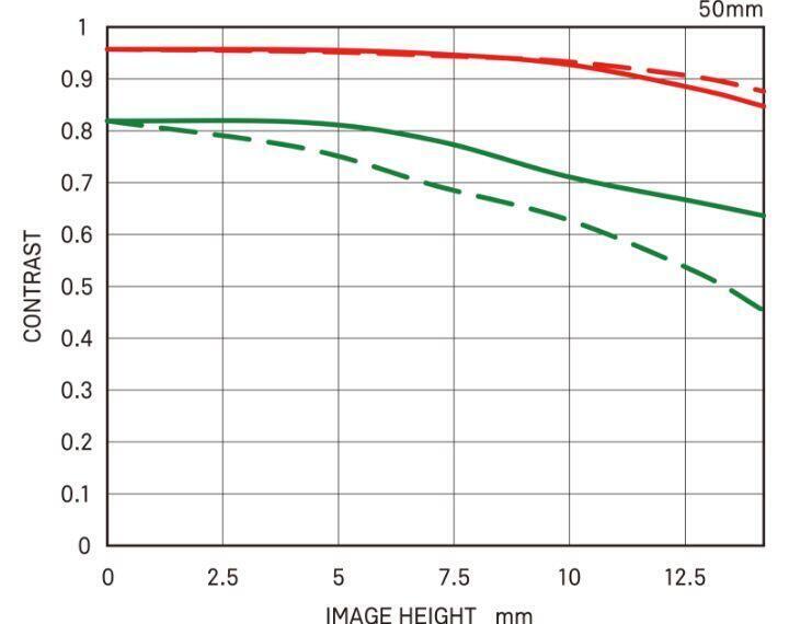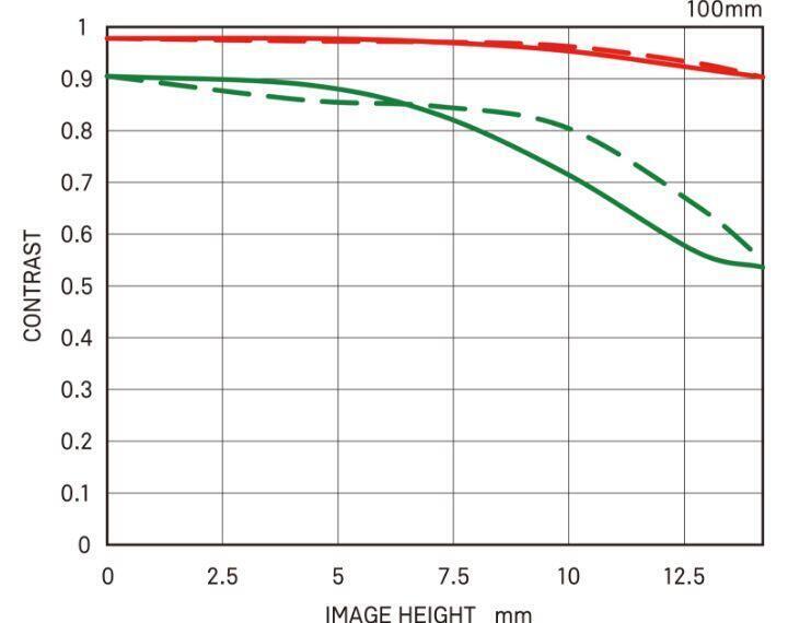 MTF (Modulation Transfer Function – Hàm Truyền Điều Biến) là một trong các phép đo để đánh giá hiệu suất của ống kính, cho thấy độ trung thực mà độ tương phản của chủ thể có thể được tái tạo trên mặt phẳng hình ảnh. Trục ngang thể hiện chiều cao hình ảnh (khoảng cách từ tâm hình ảnh tính bằng mm) và trục dọc thể hiện giá trị độ tương phản (giá trị tối đa là 1).
