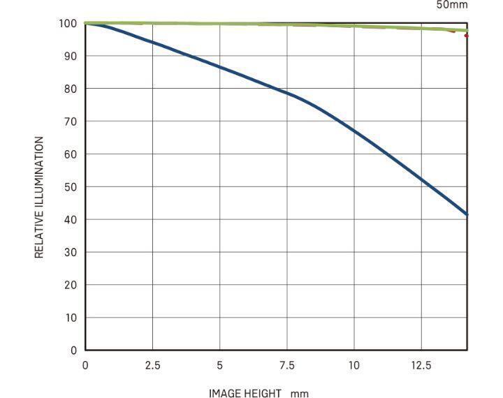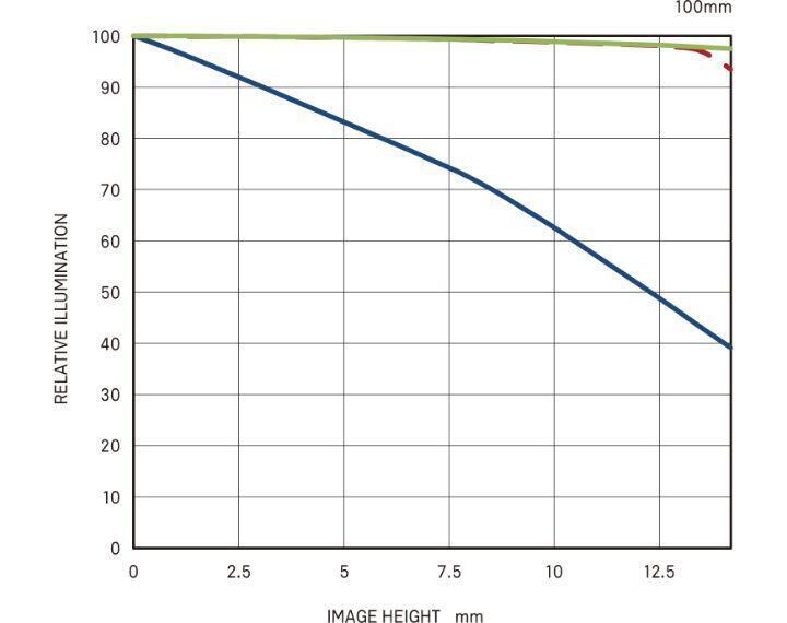 Trục ngang thể hiện chiều cao hình ảnh (khoảng cách từ tâm đến mép hình ảnh [mm]). Trục dọc thể hiện lượng ánh sáng trong hình ảnh (dựa trên lượng ánh sáng ở tâm hình ảnh là 100%). Nếu lượng ánh sáng ngoại vi thấp hơn so với tâm, bốn góc của hình ảnh sẽ tối hơn (tối góc).
