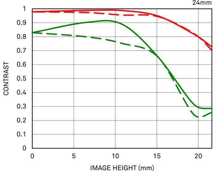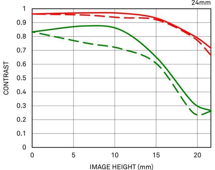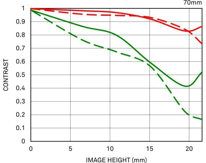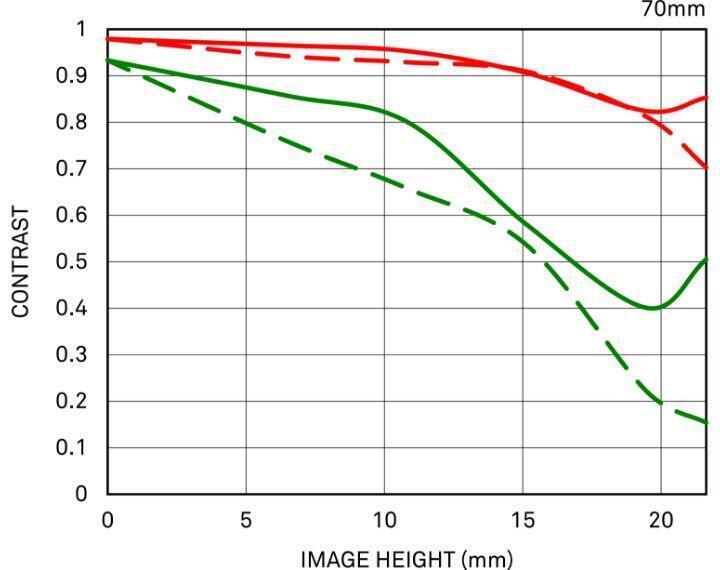 MTF (Modulation Transfer Function – Hàm Truyền Điều Biến) là một trong các phép đo để đánh giá hiệu suất của ống kính, cho thấy độ trung thực mà độ tương phản của chủ thể có thể được tái tạo trên mặt phẳng hình ảnh. Trục ngang thể hiện chiều cao hình ảnh (khoảng cách từ tâm hình ảnh tính bằng mm) và trục dọc thể hiện giá trị độ tương phản (giá trị tối đa là 1).