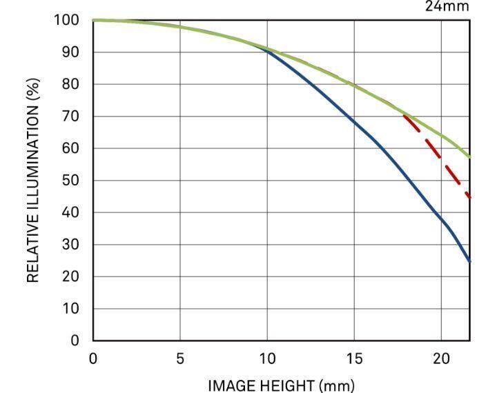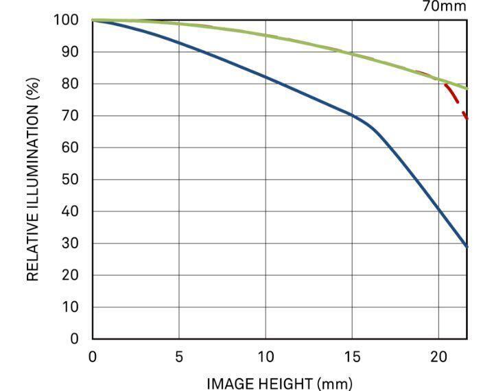 Trục ngang thể hiện chiều cao hình ảnh (khoảng cách từ tâm đến mép hình ảnh [mm]). Trục dọc thể hiện lượng ánh sáng trong hình ảnh (dựa trên lượng ánh sáng ở tâm hình ảnh là 100%). Nếu lượng ánh sáng ngoại vi thấp hơn so với tâm, bốn góc của hình ảnh sẽ tối hơn (tối góc).