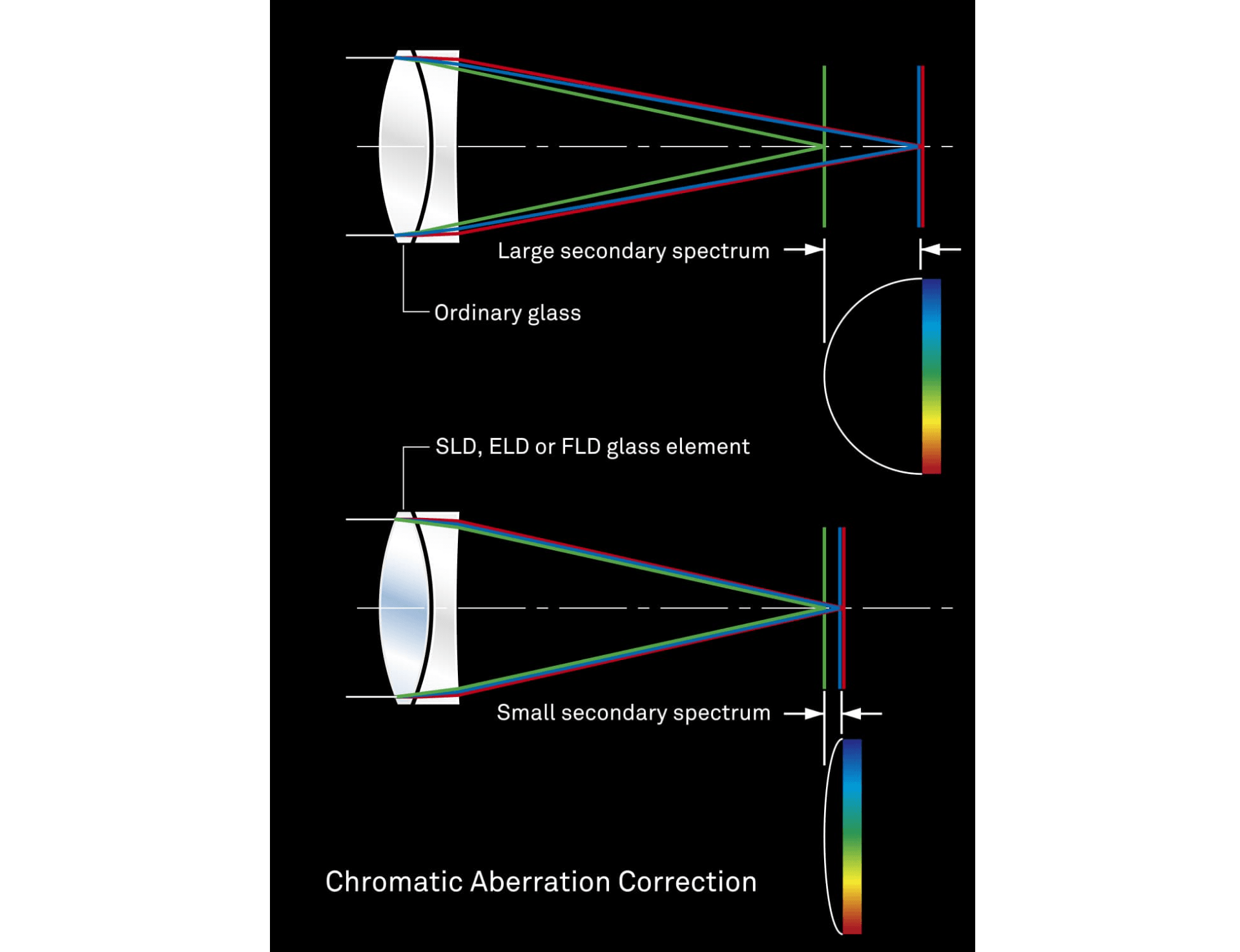 Mức độ ánh sáng bị khúc xạ bởi thủy tinh phụ thuộc vào bước sóng của ánh sáng. Thực tế này làm cho các màu sắc ánh sáng khác nhau hội tụ tại các điểm hơi khác nhau. Kết quả là quang sai màu (chromatic aberration), hiện tượng viền màu đặc biệt dễ nhận thấy ở các ống kính tele. Hầu hết quang sai màu có thể được loại bỏ bằng cách kết hợp một thấu kính lồi có độ khúc xạ cao với một thấu kính lõm có độ khúc xạ thấp. Tuy nhiên, quang sai màu còn sót lại, được gọi là “phổ thứ cấp” (secondary spectrum), vẫn có thể tồn tại. Để giảm thiểu phổ thứ cấp này, vốn có thể là một vấn đề nghiêm trọng với các ống kính thông thường, ống kính Sigma có tới ba loại thấu kính tán sắc thấp độc quyền mang lại hiệu suất vượt trội: ELD (Extraordinary Low Dispersion – Tán Sắc Cực Thấp), SLD (Special Low Dispersion – Tán Sắc Thấp Đặc Biệt) và FLD (“F” Low Dispersion – Tán Sắc Thấp “F”). Đặc biệt, thấu kính FLD mang lại độ tán sắc cực thấp kết hợp với độ truyền sáng cao và các đặc tính tán sắc bất thường của fluorite. Việc triển khai tỉ mỉ các loại thấu kính tán sắc thấp độc quyền này và tối ưu hóa phân bố công suất giúp ống kính Sigma tái tạo hình ảnh siêu việt mà không bị giảm chất lượng do quang sai màu còn sót lại.