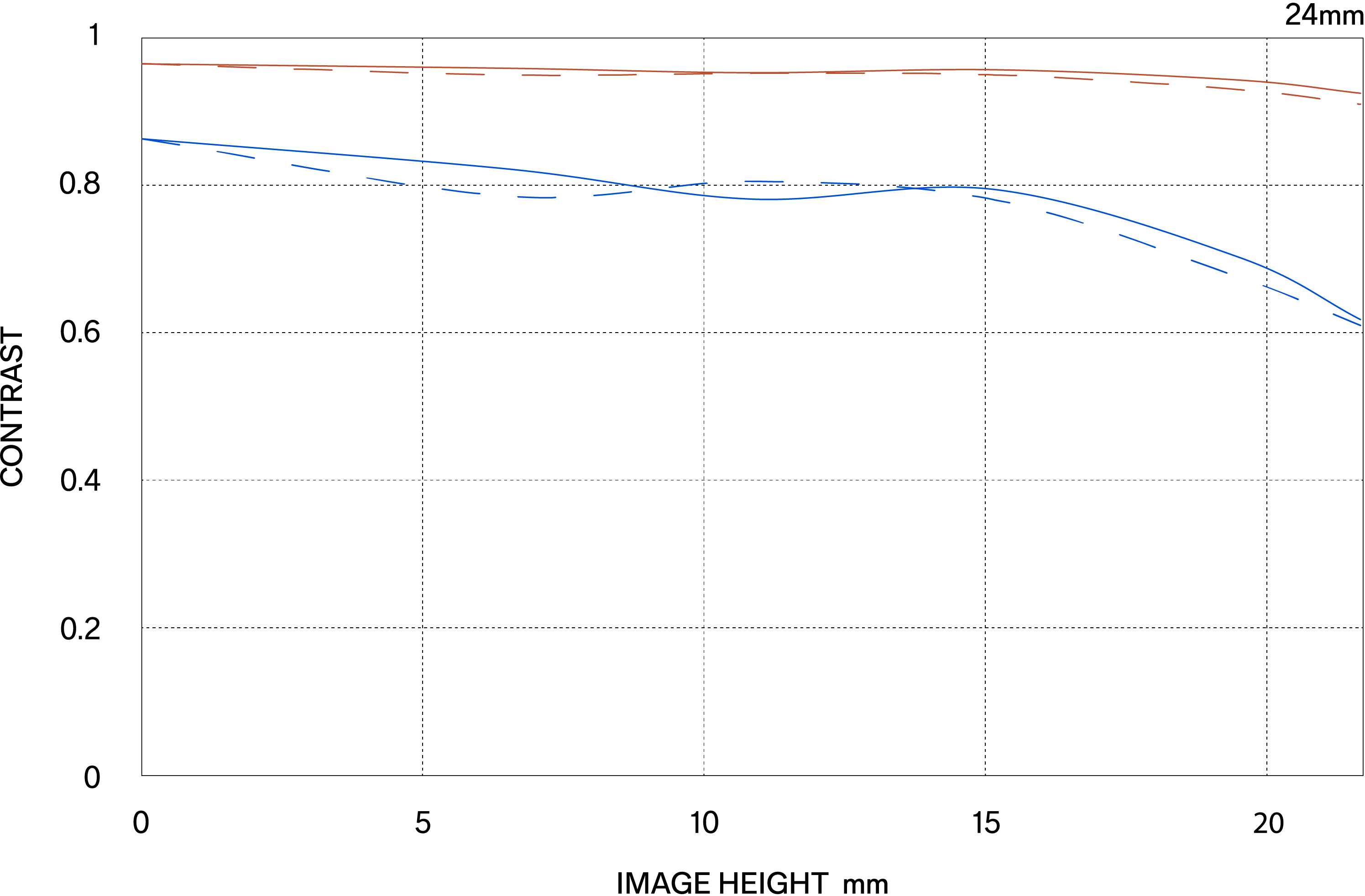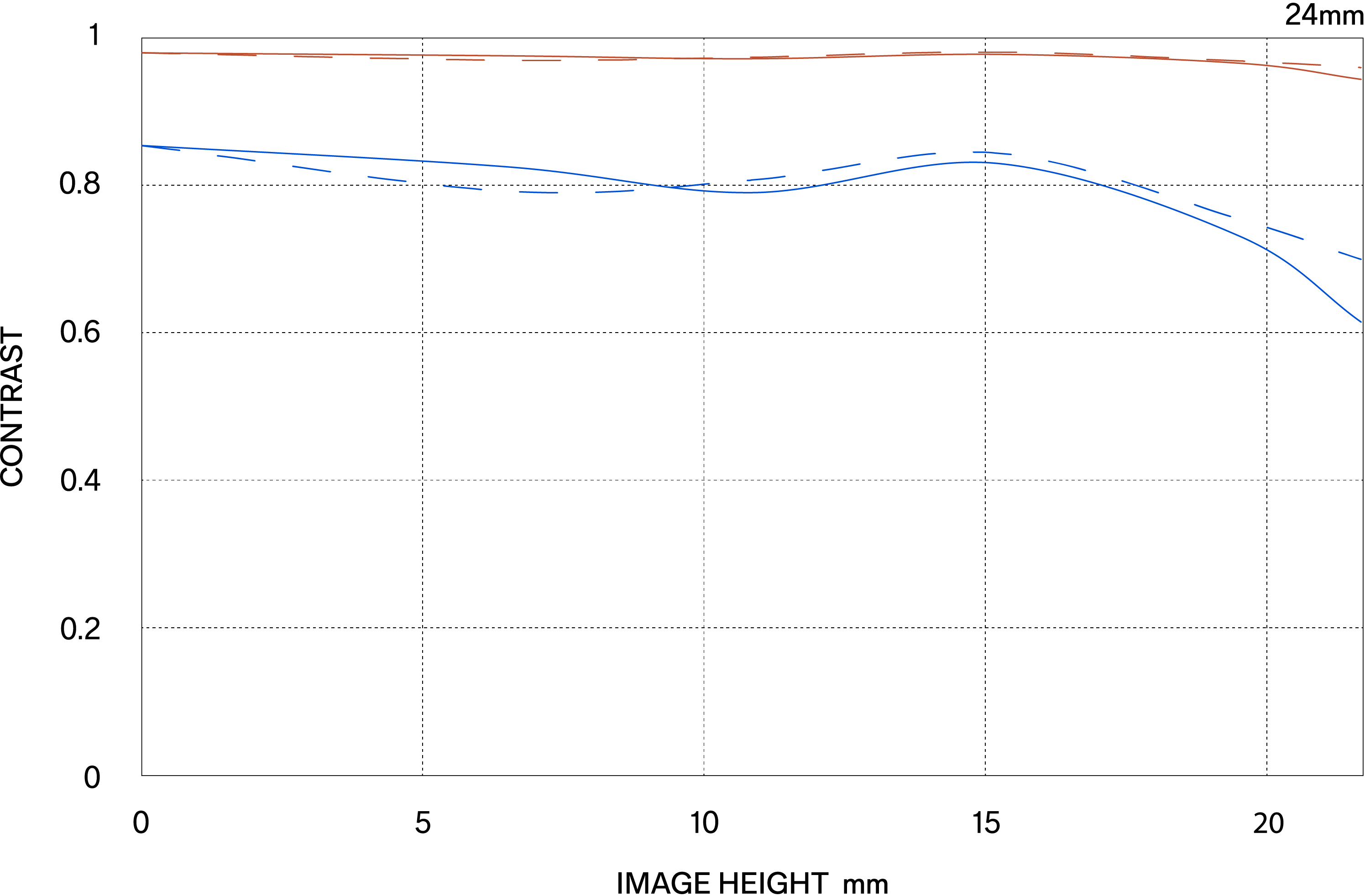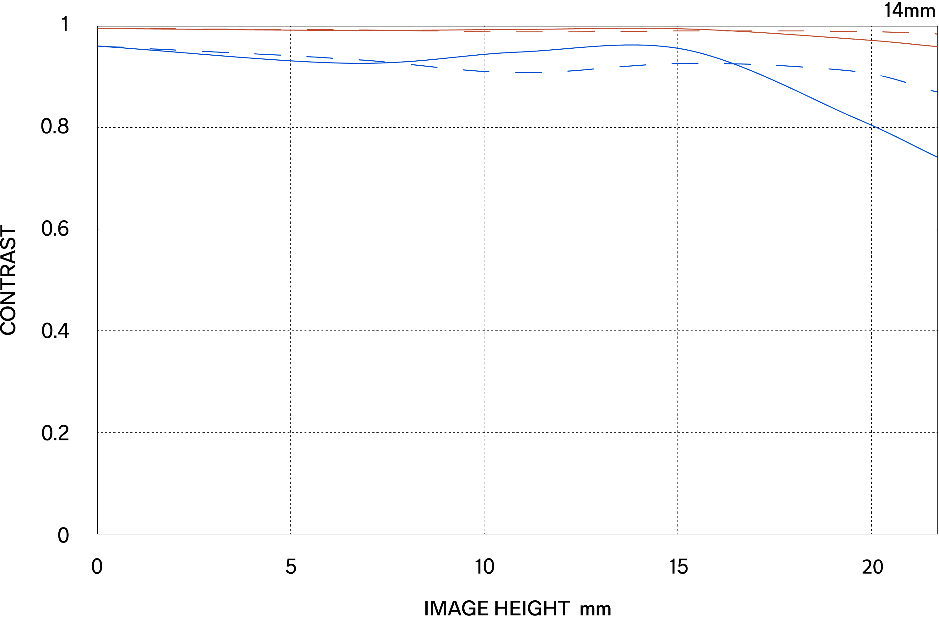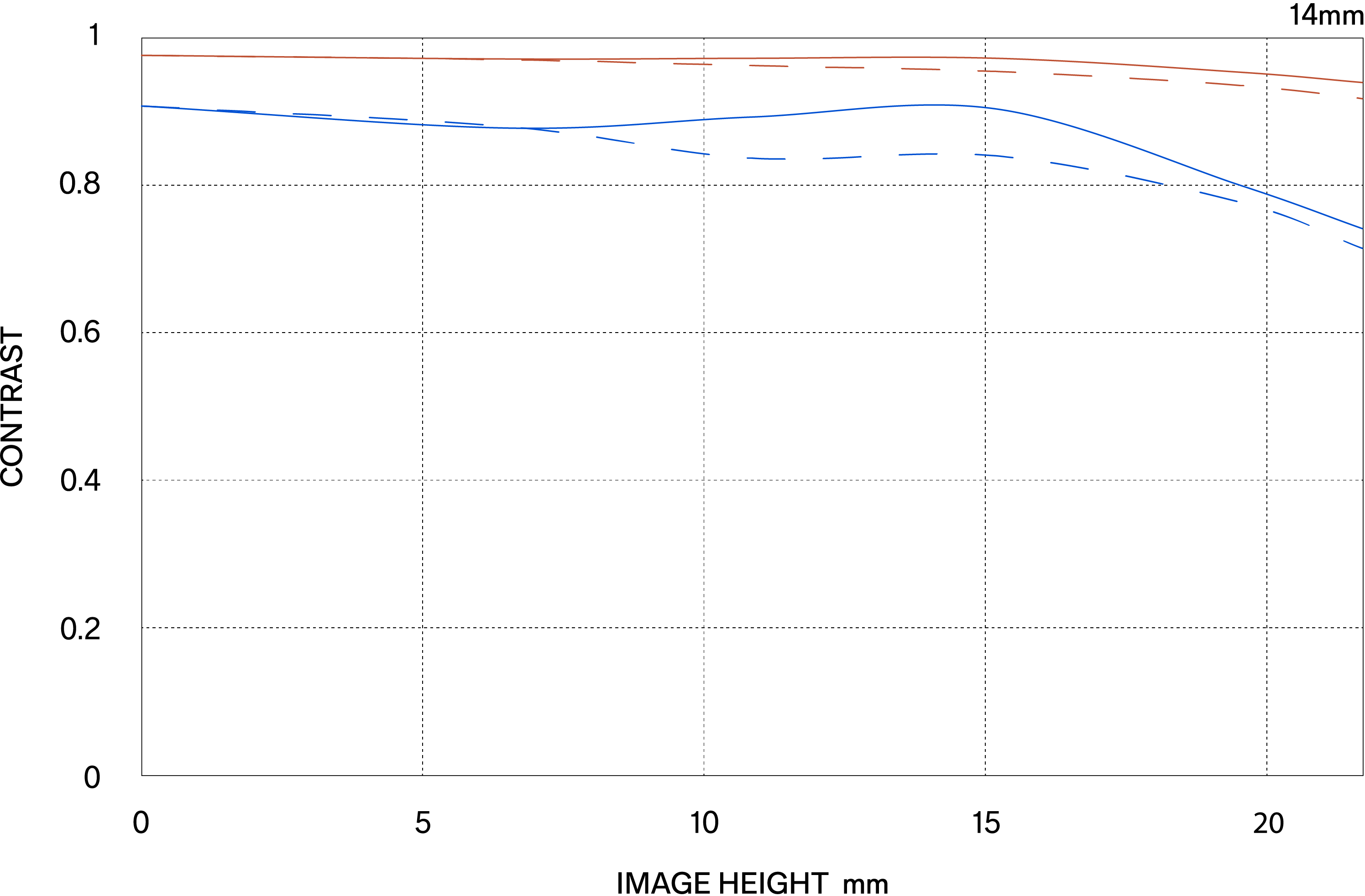 The MTF (Modulation Transfer Function) is one of the measurements for evaluating a lens’ performance, and it shows how faithfully the contrast of the subject can be reproduced on the image plane. The horizontal axis shows the image height (distance from the center of the image in mm) and the vertical axis shows the contrast value (maximum value is 1).