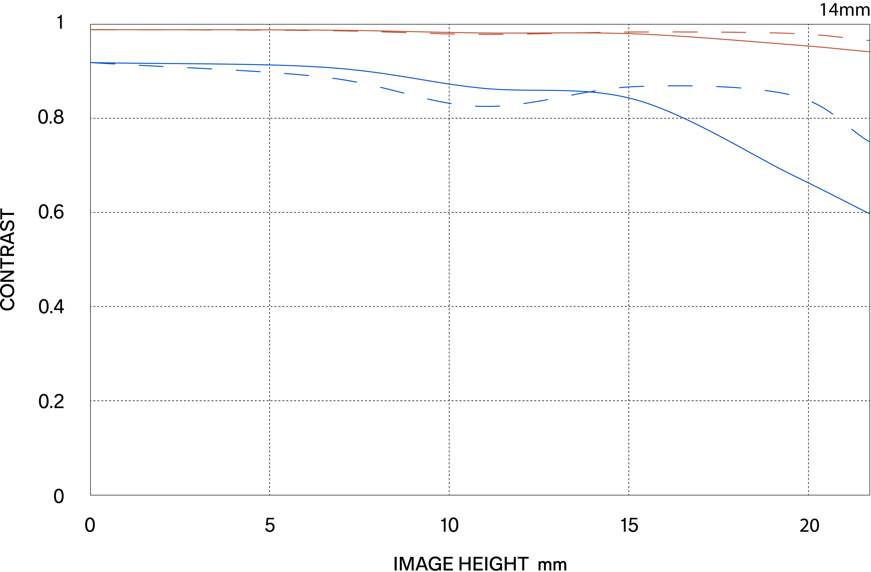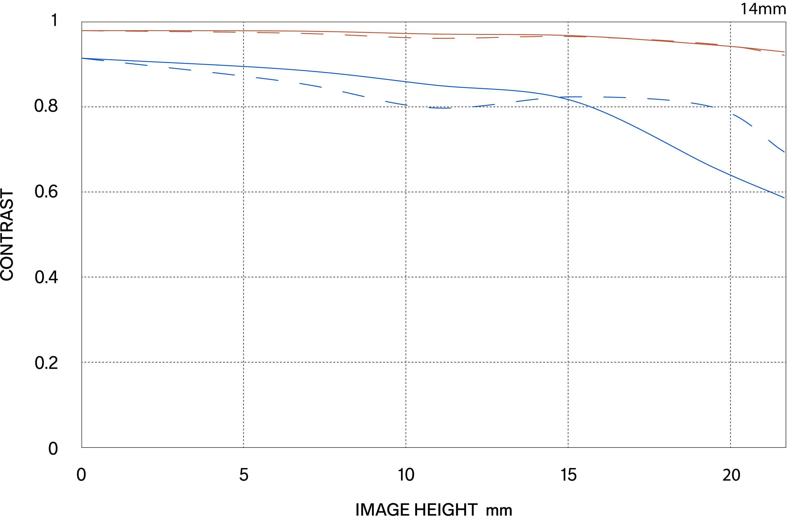 MTF (Modulation Transfer Function – Hàm Truyền Tải Điều Biến) là một trong những phép đo để đánh giá hiệu suất của ống kính và cho thấy độ trung thực của độ tương phản đối tượng có thể được tái tạo trên mặt phẳng hình ảnh. Trục hoành biểu thị chiều cao hình ảnh (khoảng cách tính bằng mm từ tâm hình ảnh) và trục tung biểu thị giá trị độ tương phản (giá trị tối đa là 1).