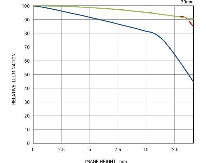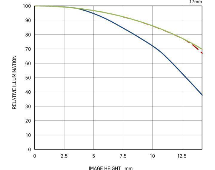 Trục hoành biểu thị chiều cao hình ảnh (khoảng cách từ tâm đến cạnh hình ảnh [mm]). Trục tung biểu thị lượng ánh sáng trong hình ảnh (dựa trên lượng ánh sáng ở tâm hình ảnh là 100%). Nếu lượng ánh sáng ở ngoại vi thấp hơn so với tâm, bốn góc của hình ảnh sẽ tối hơn (tối góc – vignetting).