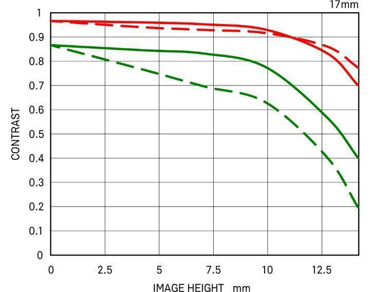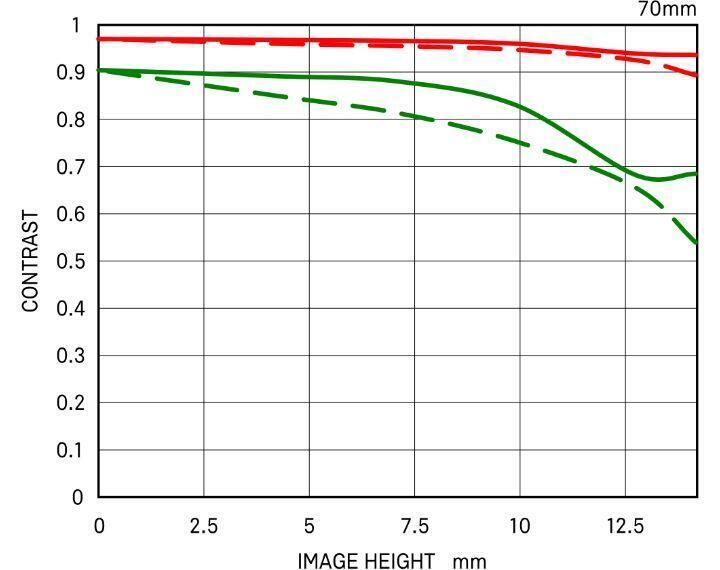 MTF (Modulation Transfer Function – Hàm Truyền Tải Điều Biến) là một trong những phép đo để đánh giá hiệu suất của ống kính và cho thấy độ trung thực của độ tương phản đối tượng có thể được tái tạo trên mặt phẳng hình ảnh. Trục hoành biểu thị chiều cao hình ảnh (khoảng cách tính bằng mm từ tâm hình ảnh) và trục tung biểu thị giá trị độ tương phản (giá trị tối đa là 1).
