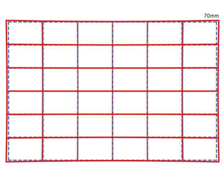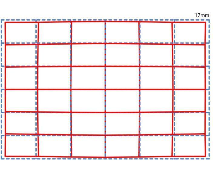 Khi bạn chụp một mẫu lưới, nó sẽ xuất hiện như đường chấm xanh lam. Đường màu đỏ minh họa cách mẫu lưới sẽ xuất hiện trong ảnh thực tế khi đã tính đến bất kỳ sự méo hình nào của ống kính.