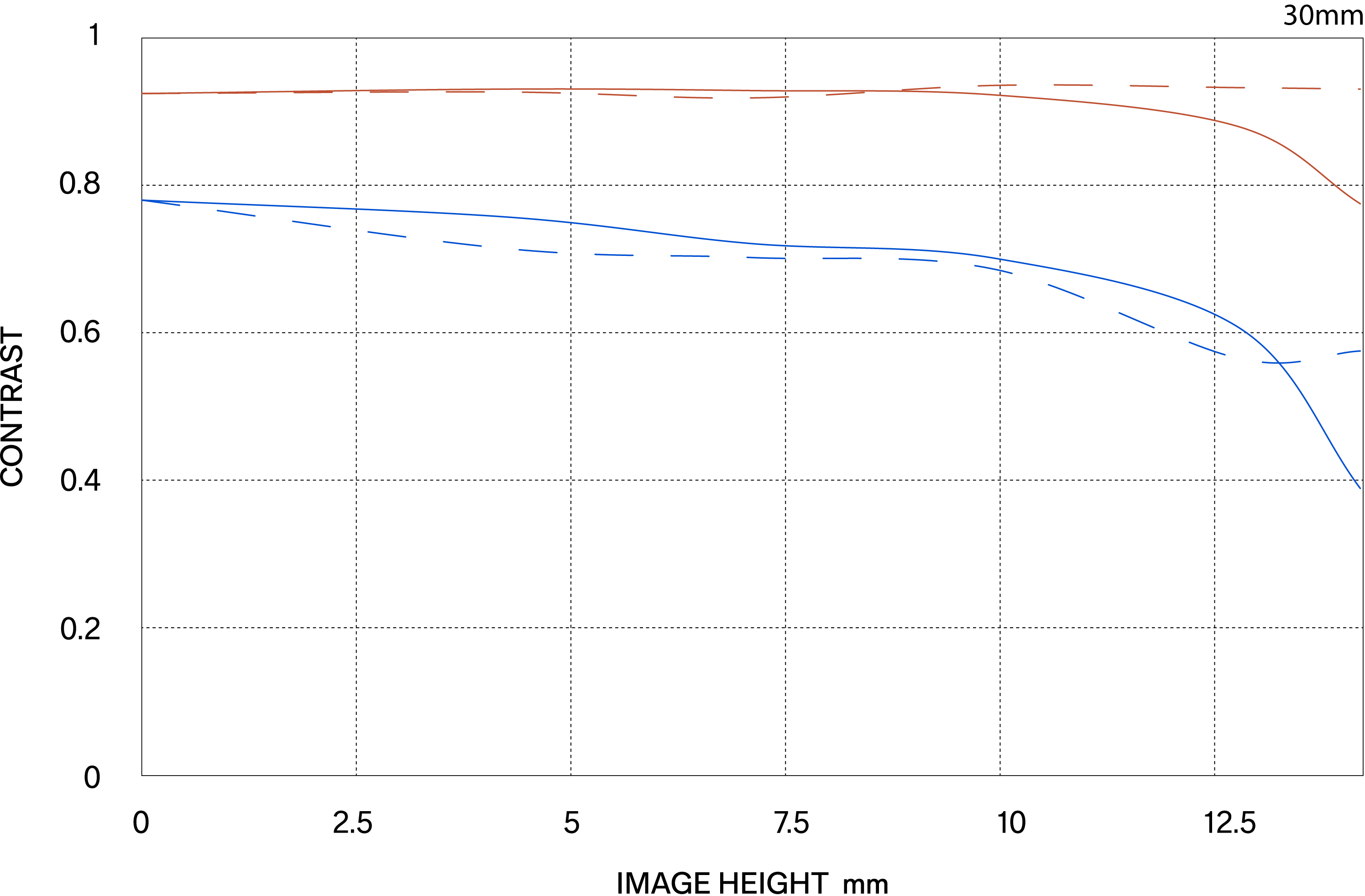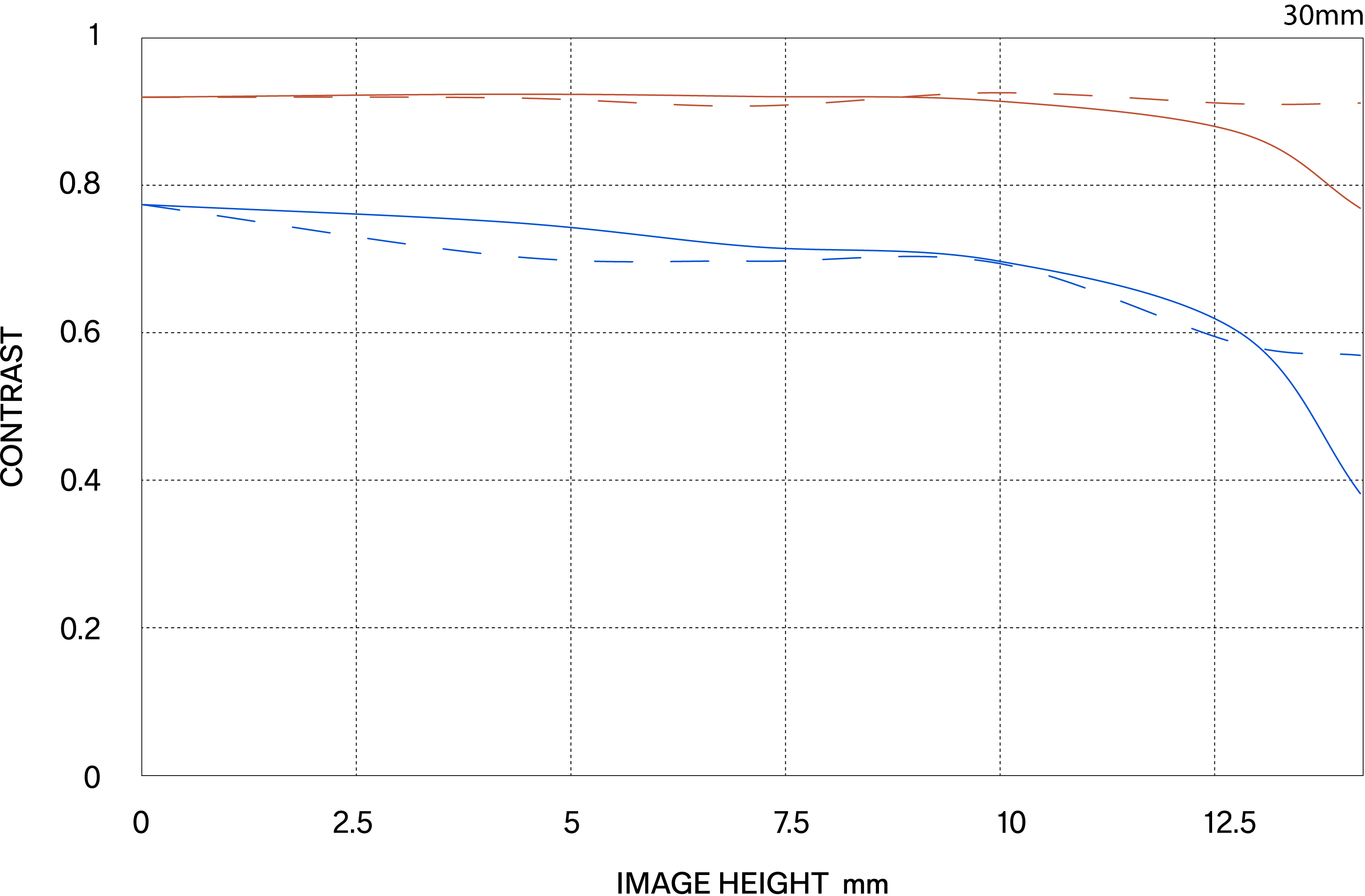 MTF (Modulation Transfer Function – Hàm Truyền Tải Điều Biến) là một trong những phép đo để đánh giá hiệu suất của ống kính và nó cho thấy độ trung thực mà độ tương phản của chủ thể có thể được tái tạo trên mặt phẳng hình ảnh. Trục ngang thể hiện chiều cao hình ảnh (khoảng cách từ tâm ảnh tính bằng mm) và trục dọc thể hiện giá trị độ tương phản (giá trị tối đa là 1).