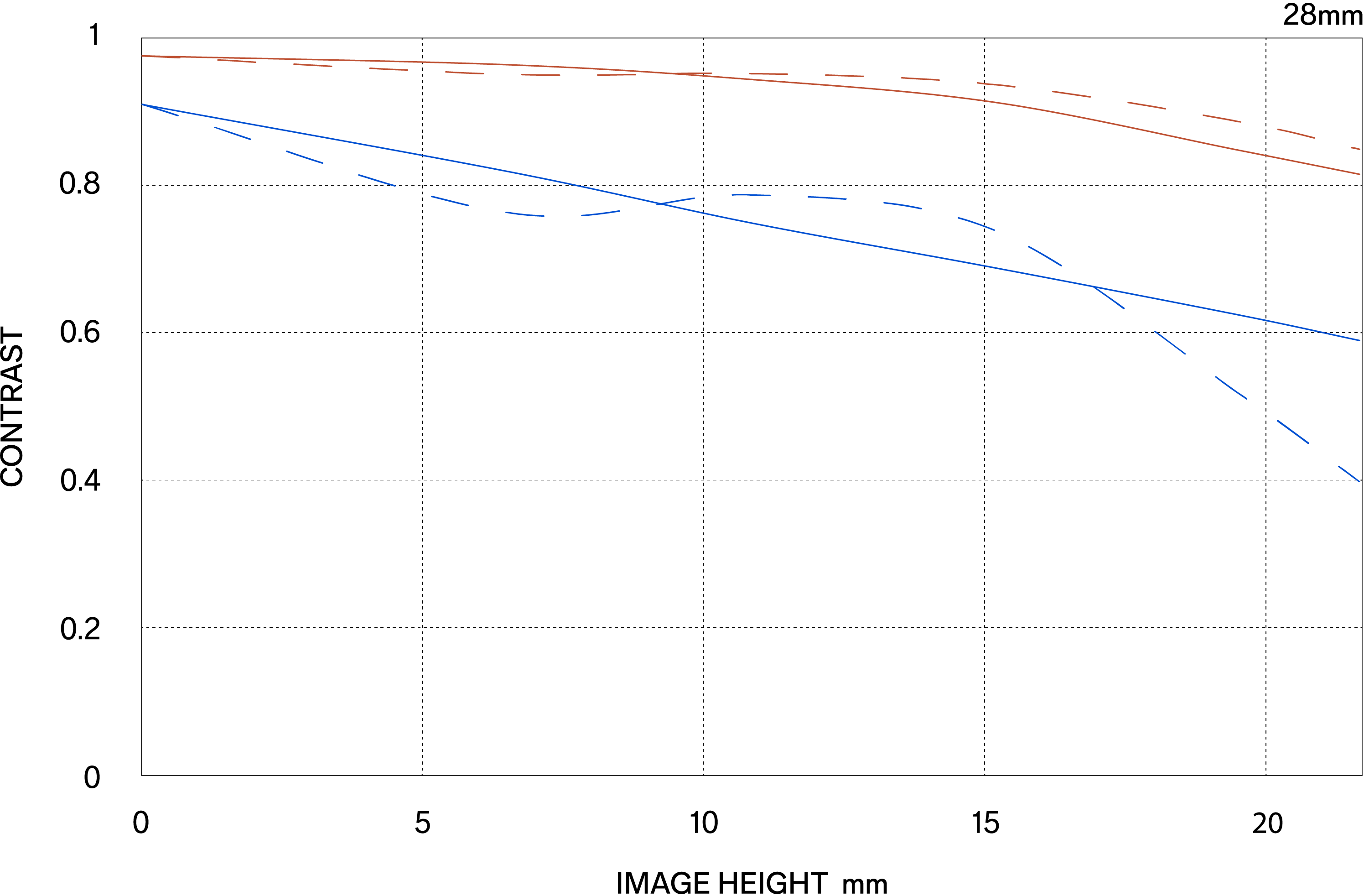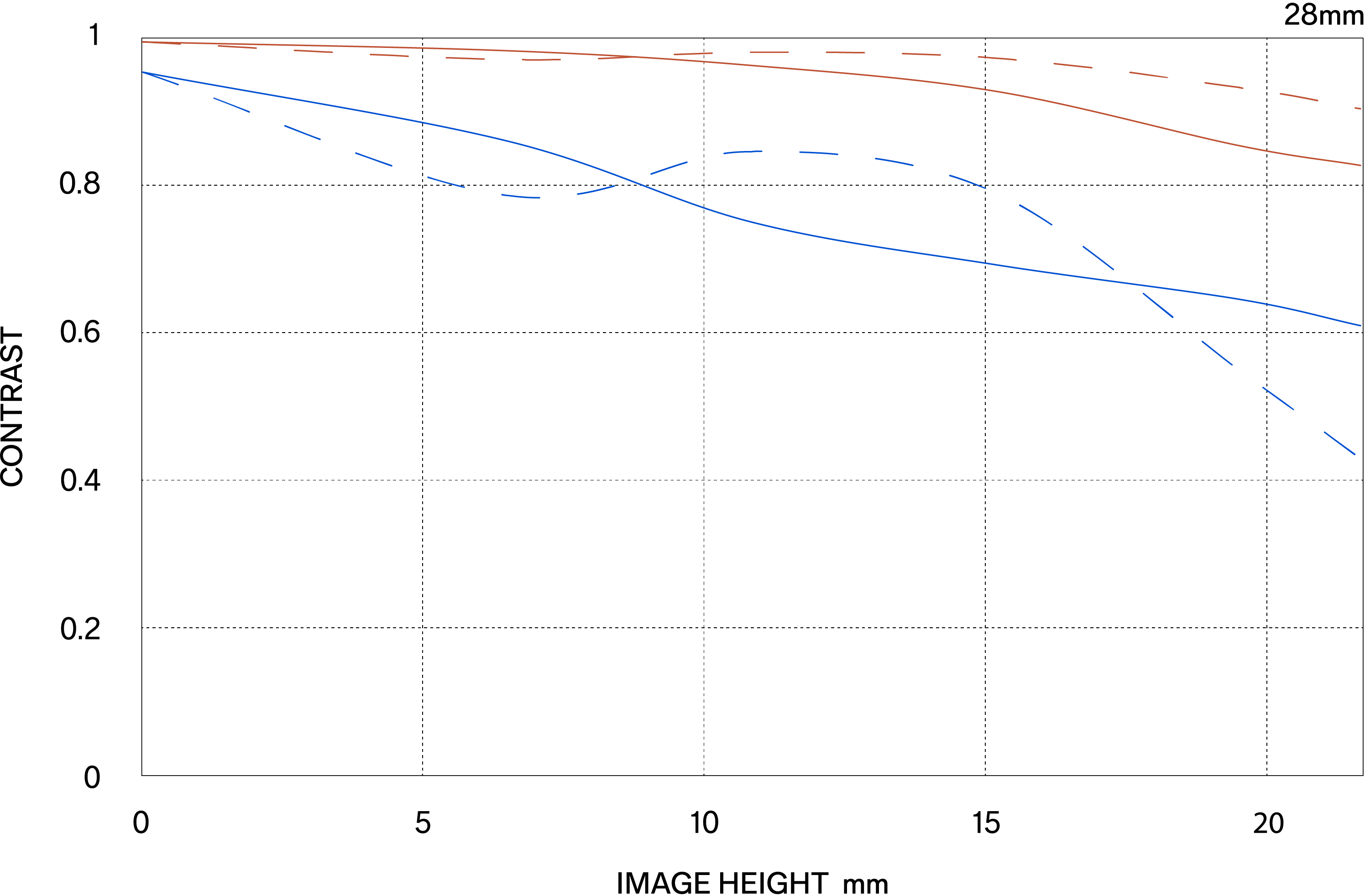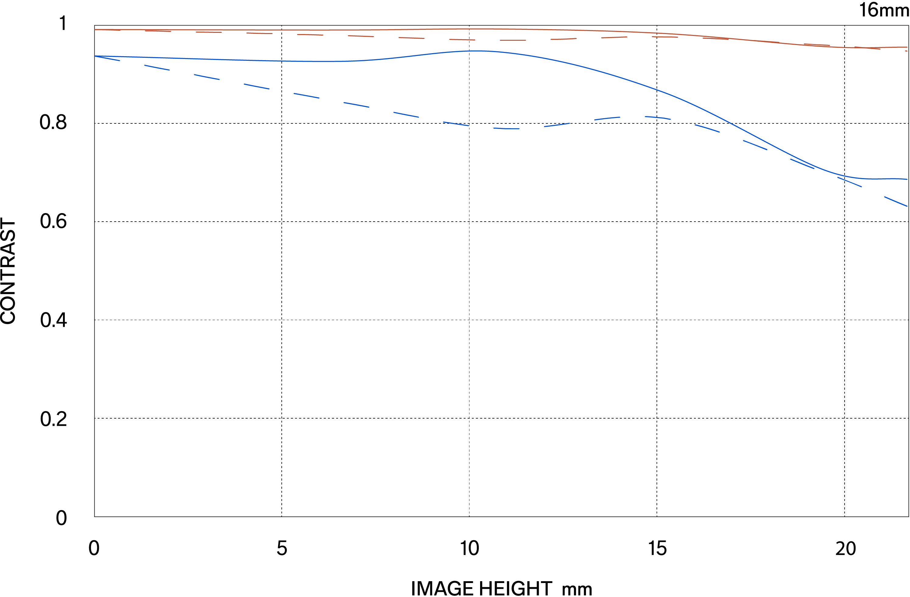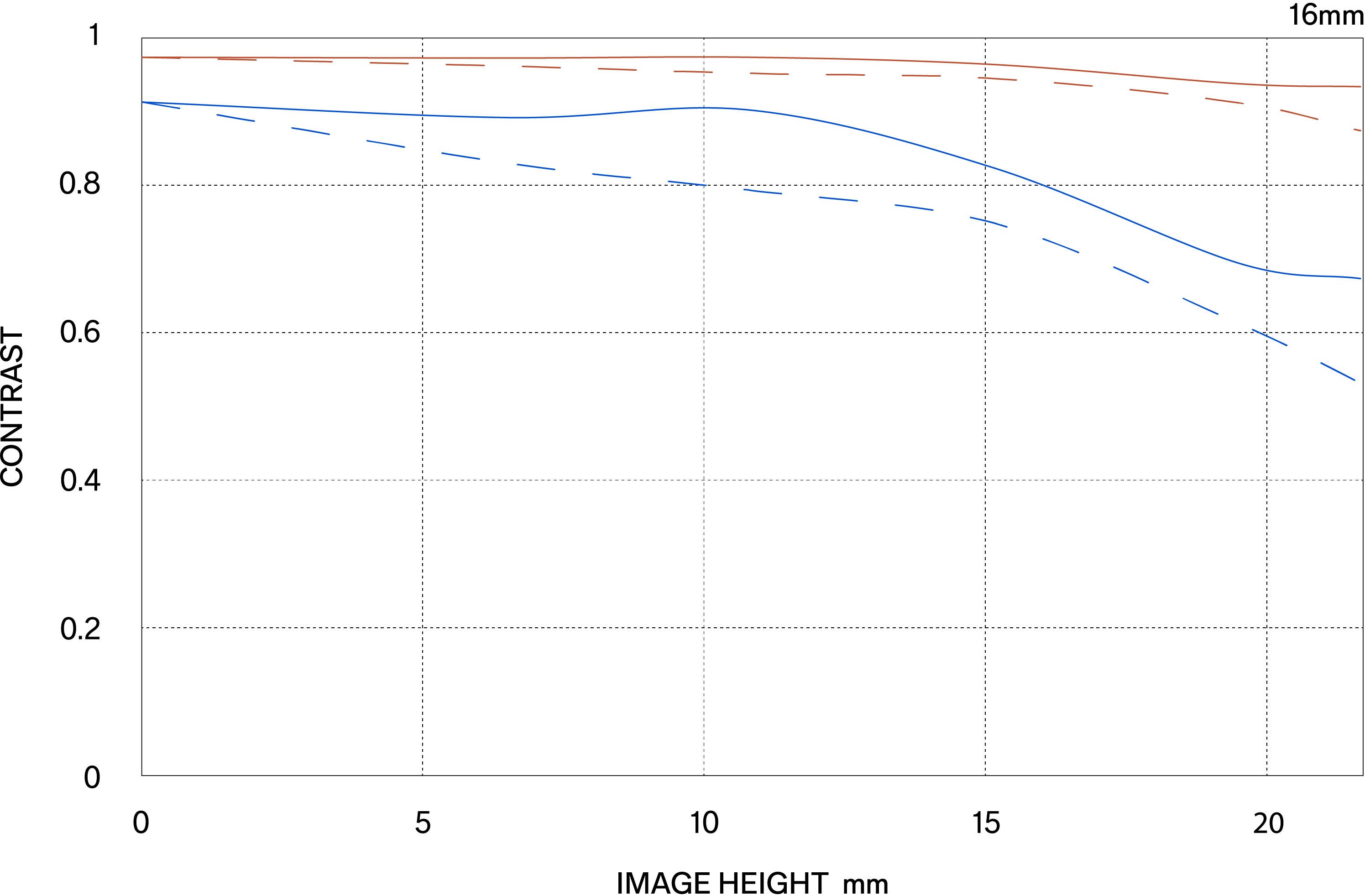 MTF (Modulation Transfer Function – Hàm Truyền Tải Điều Biến) là một trong những phép đo để đánh giá hiệu suất của ống kính và nó cho thấy độ trung thực mà độ tương phản của chủ thể có thể được tái tạo trên mặt phẳng hình ảnh. Trục ngang thể hiện chiều cao hình ảnh (khoảng cách từ tâm ảnh tính bằng mm) và trục dọc thể hiện giá trị độ tương phản (giá trị tối đa là 1).