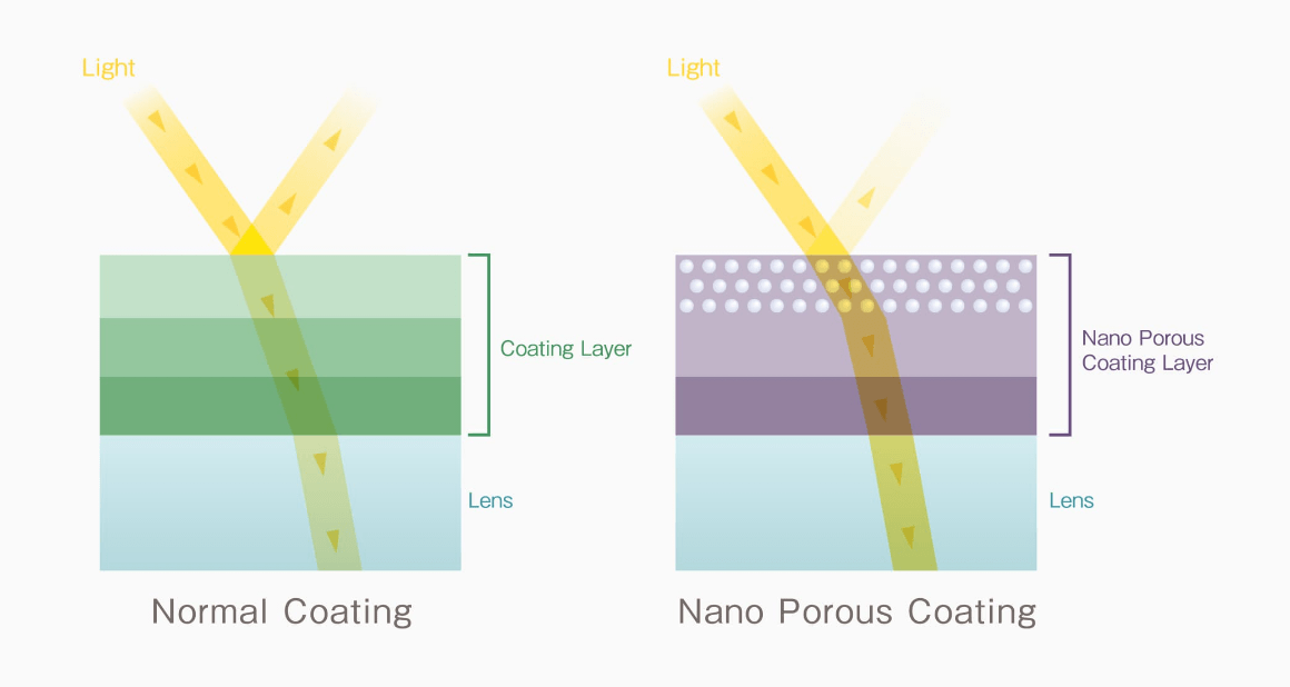 “NPC (Nano Porous Coating)” sử dụng silica xốp làm vật liệu phủ. Lớp silica xốp có các lỗ kích thước nano chứa không khí bên trong. Việc có các lỗ kích thước này giúp giảm đáng kể chiết suất, cho phép giảm độ phản xạ hơn so với các lớp phủ chống phản xạ thông thường. Kết quả là, ánh sáng phản xạ gây lóa (flare) và bóng ma (ghosting) giảm mạnh, đạt được chất lượng hình ảnh rõ nét.