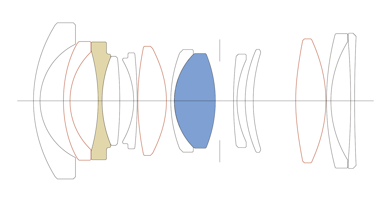 13 thấu kính trong 11 nhóm (gồm 1 thấu kính FLD, 1 thấu kính SLD và 3 thấu kính phi cầu)