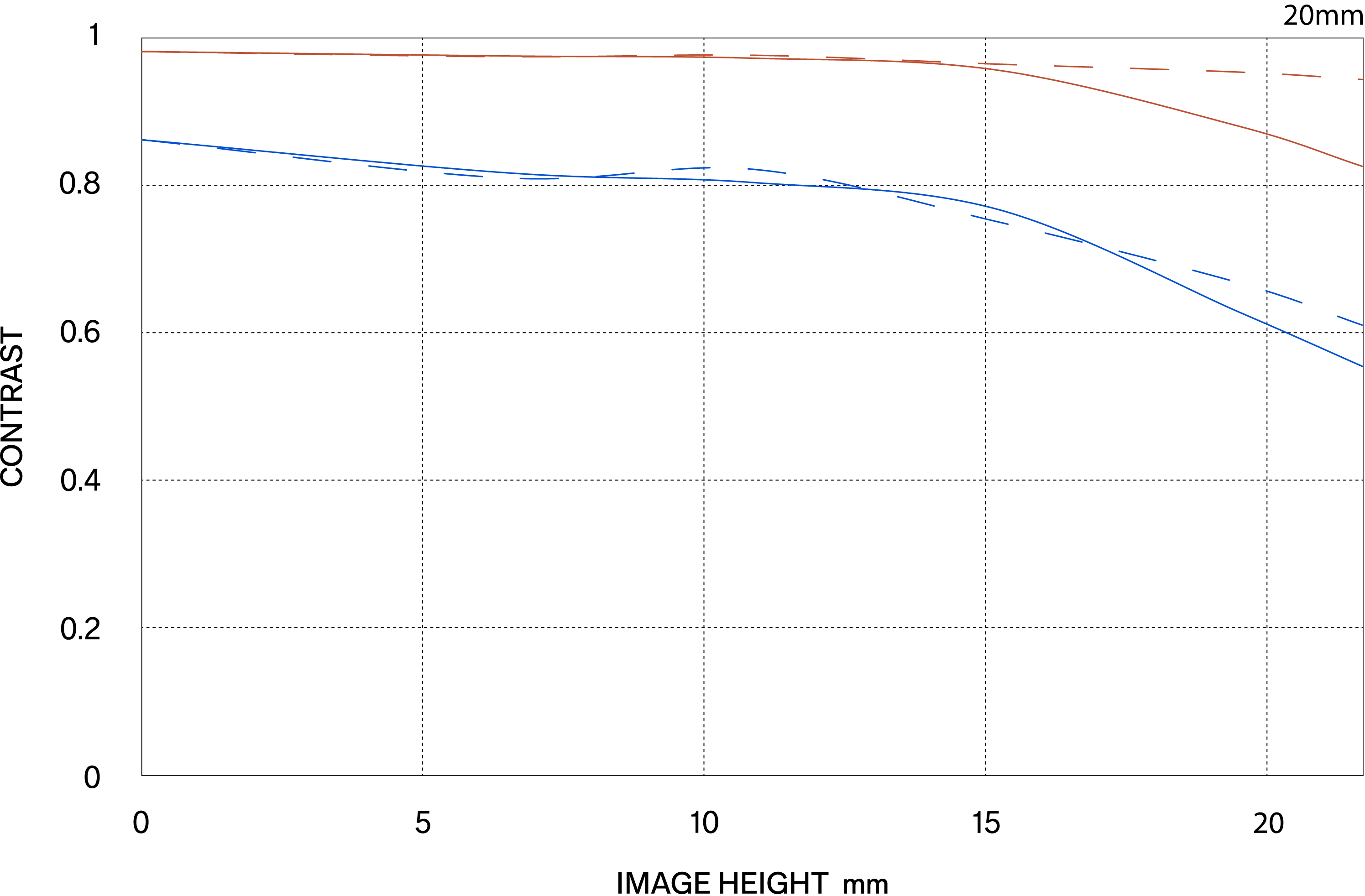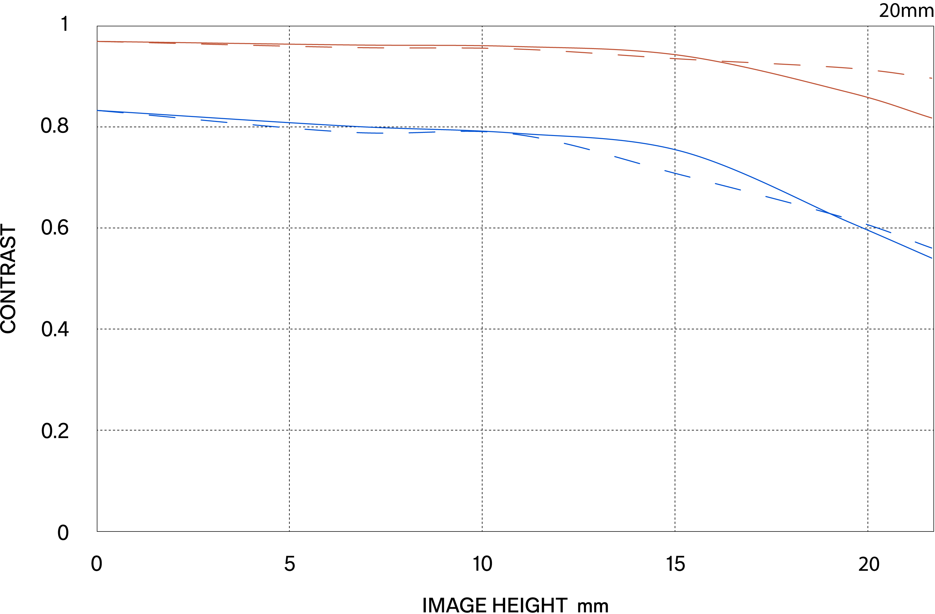 MTF (Hàm Truyền Tải Điều Biến) là một trong các phép đo để đánh giá hiệu suất của ống kính, và nó thể hiện mức độ trung thực mà độ tương phản của chủ thể có thể được tái tạo trên mặt phẳng hình ảnh. Trục ngang thể hiện chiều cao hình ảnh (khoảng cách từ tâm ảnh tính bằng mm) và trục dọc thể hiện giá trị độ tương phản (giá trị tối đa là 1).