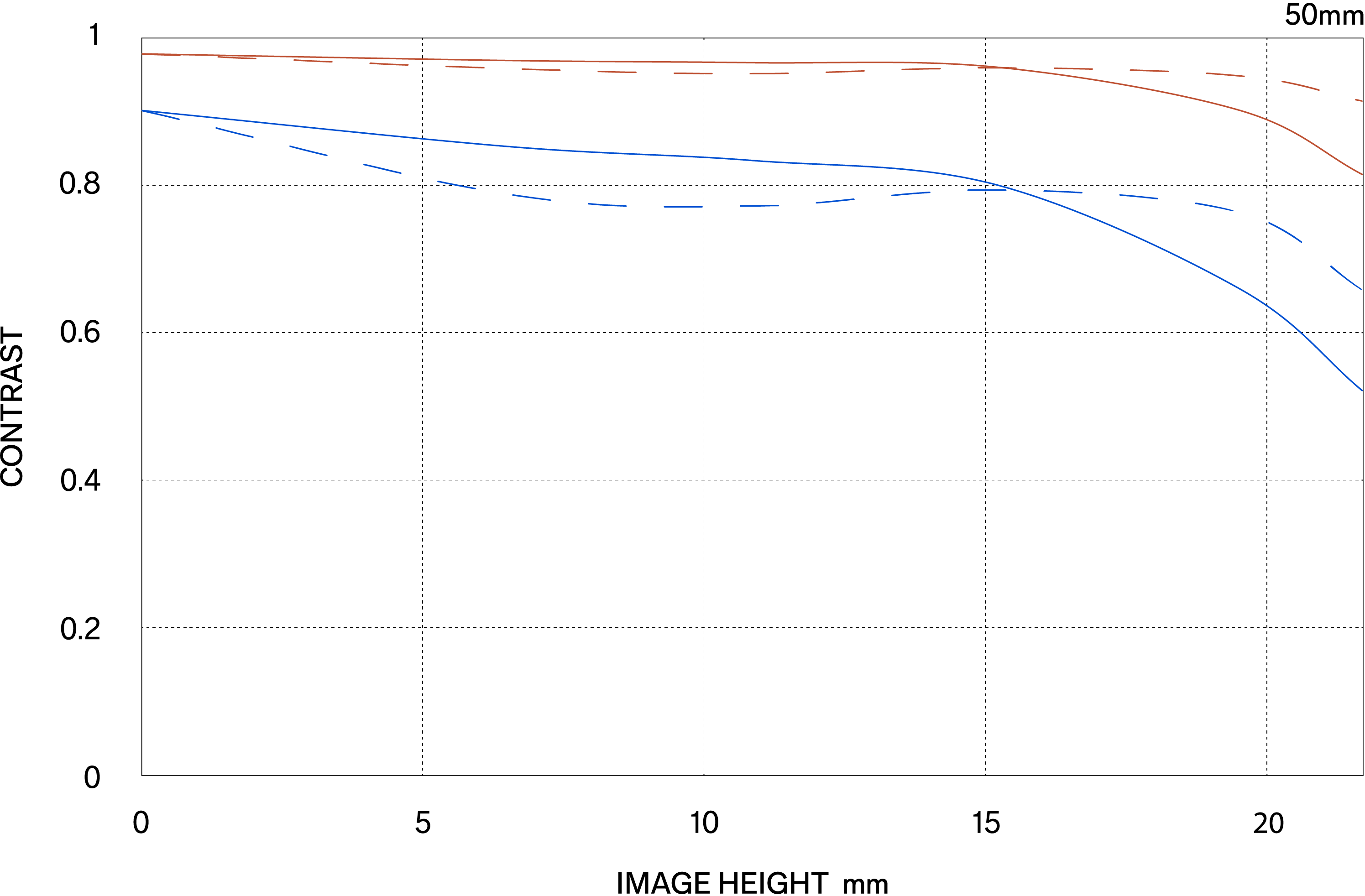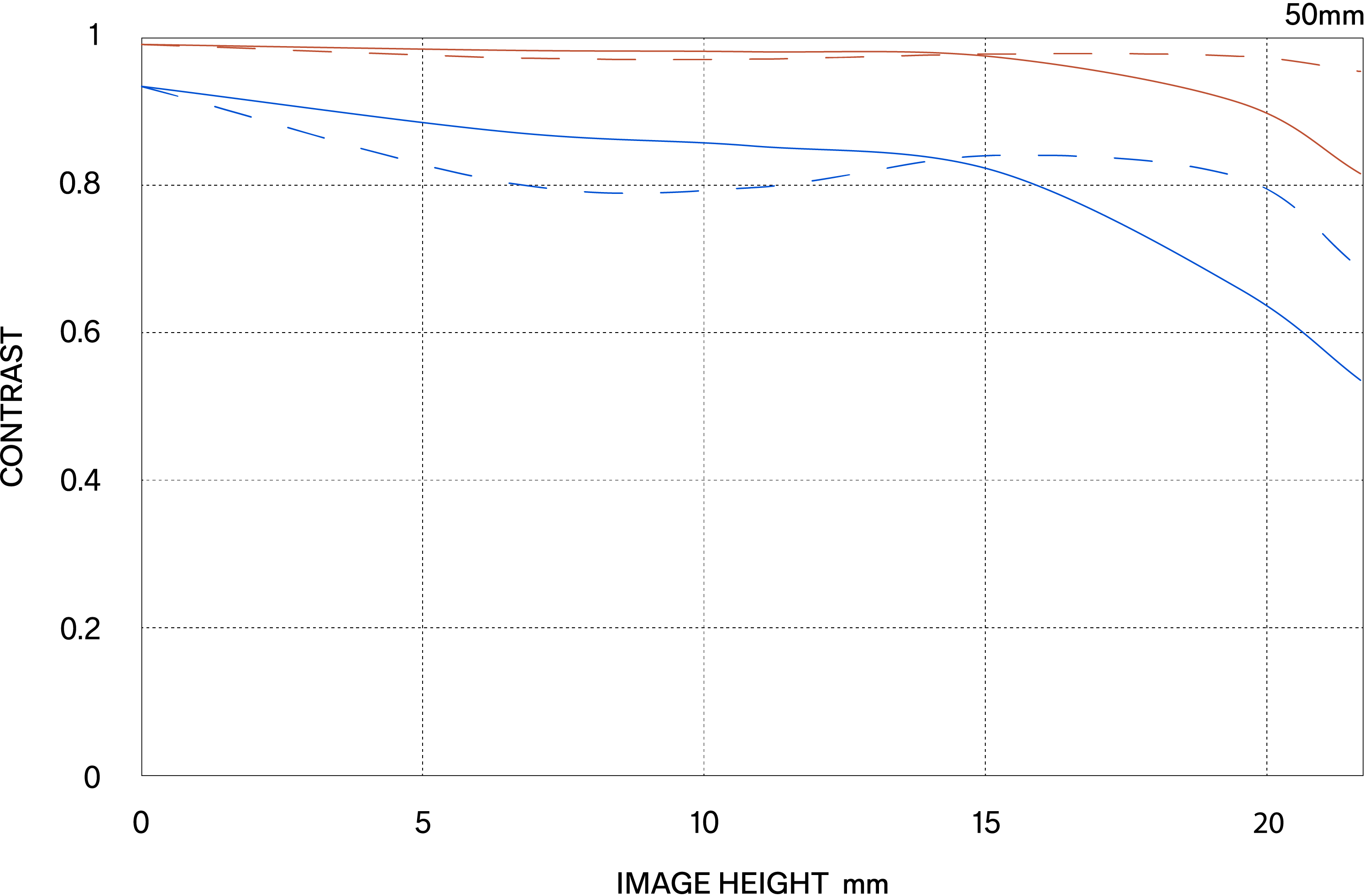 MTF (Hàm Truyền Tải Điều Biến) là một trong các phép đo để đánh giá hiệu suất của ống kính, và nó thể hiện mức độ trung thực mà độ tương phản của chủ thể có thể được tái tạo trên mặt phẳng hình ảnh. Trục ngang thể hiện chiều cao hình ảnh (khoảng cách từ tâm ảnh tính bằng mm) và trục dọc thể hiện giá trị độ tương phản (giá trị tối đa là 1).