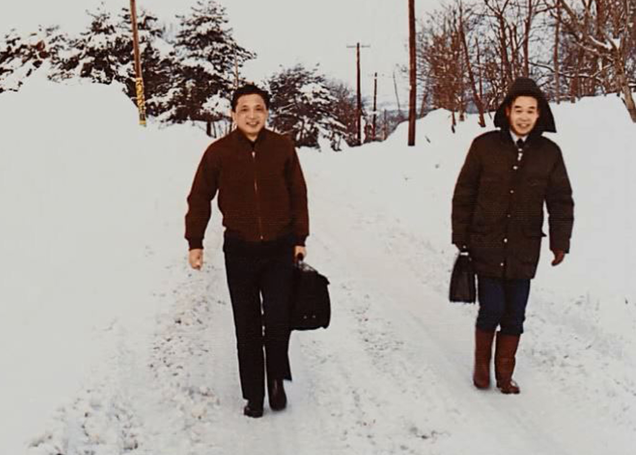 Ông Michihiro Yamaki (trái), CEO thời điểm đó, đi đến nhà máy Aizu trong tuyết năm 1979. Ước mơ của ông là Aizu sẽ trở thành “Jena” của Nhật Bản (Quê hương của Carl Zeiss tại Đức).