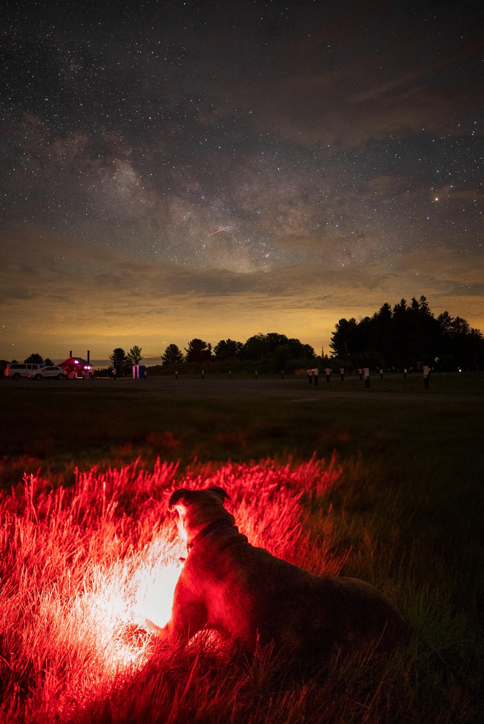 Tôi đã chụp vài bức ảnh Kona và tôi chơi đùa trong khi chờ Dải Ngân Hà di chuyển vào vị trí để giúp kỷ niệm chuyến phiêu lưu nhiều ngày của chúng tôi. Với chiếc đèn đeo trán trang bị ánh sáng đỏ của riêng mình, tôi có thể dễ dàng điều chỉnh tiêu điểm trong khi sử dụng ống kính ở F1.4 và tận dụng chế độ xem trực tiếp (live view) trên máy ảnh mirrorless của mình. Tôi vẫn ngạc nhiên về việc Kona đã học cách đứng yên tốt như thế nào cho những bức ảnh phơi sáng dài này! Nếu bạn có thể xem kho ảnh của tôi, có lẽ tôi làm hỏng nhiều khung hình do cử động hơn là cậu ấy.