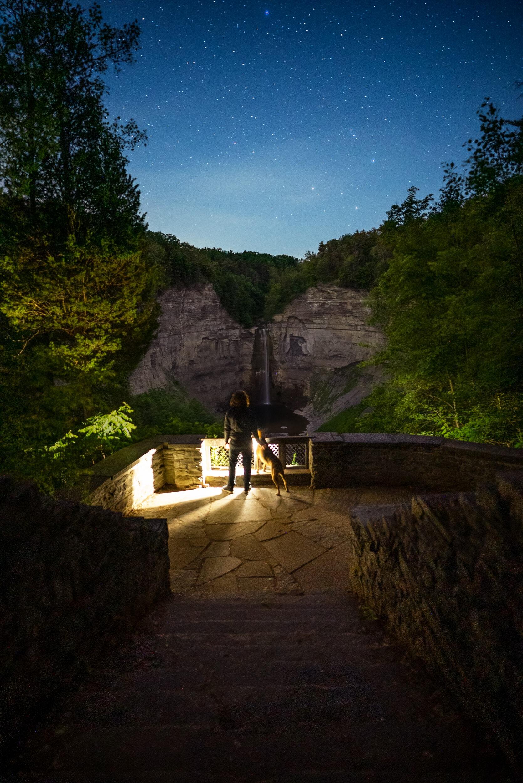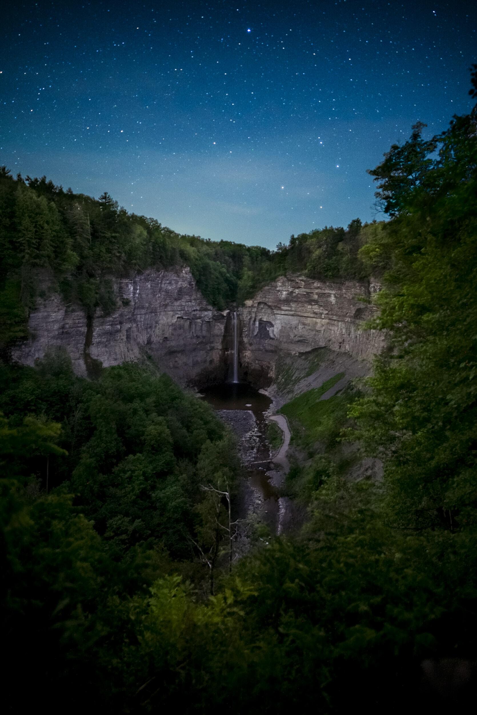 Đầu tiên, tôi đặt một khu cắm trại tại Thác Taughannock gần Ithaca, New York. Thật không may, hầu hết khu vực này đóng cửa vào ban đêm, nhưng tôi đã xin phép được một nhân viên kiểm lâm để chụp vài bức ảnh tại đài quan sát thác nước. Mặc dù buổi chụp đầu tiên với ống kính mới này khá ngắn ngủi, nhưng nó không hề dễ dàng. Với rất ít ánh sáng sẵn có, tôi đã tận dụng lợi thế khẩu độ lớn và chụp mở khẩu tối đa tại F1.4 để cố gắng thu được chi tiết từ hẻm núi khổng lồ trước mặt. Năm bức ảnh phơi sáng liên tiếp được chụp với cùng một thông số cài đặt để chồng hình (stack) tiền cảnh nhằm khử nhiễu trong khâu hậu kỳ.