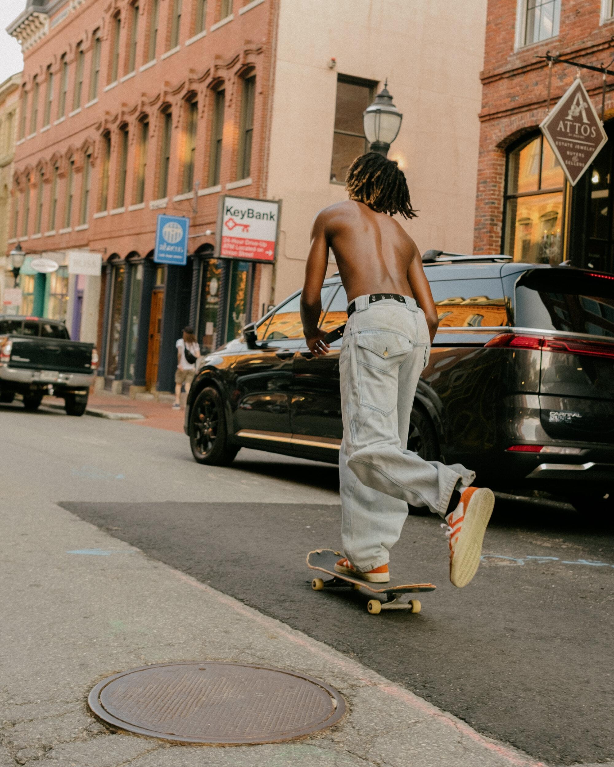 Thành phố ven biển Portland là điểm dừng chân đầu tiên của tôi. Tôi ngay lập tức bị thu hút bởi khu Cảng Cũ (Old Port). Khi đang đi bộ về phía đó, tôi thấy một chàng trai đang trượt ván xuống phố. Sự tương phản giữa những tòa nhà gạch cũ kỹ và người trượt ván trẻ trung sành điệu khiến tôi muốn chụp chân dung cậu ấy. Đây là một trong những điều tôi thích nhất ở nhiếp ảnh đường phố; cơ hội gặp gỡ những người mới và bước vào thế giới của họ trong một khoảnh khắc ngắn ngủi. Trước đây tôi thường ngại ngùng khi xin chụp chân dung người lạ, nhưng sau nhiều năm thực hiện, việc đó trở nên khá dễ dàng. Tôi luôn tiếp cận chủ thể bằng một lời khen, nói cho họ biết tôi là ai và tôi làm gì, sau đó hỏi xem tôi có thể chụp chân dung họ không. Họ thường sẽ đồng ý. Chìa khóa là hãy trung thực về ý định của bạn và khiến họ mỉm cười một chút.